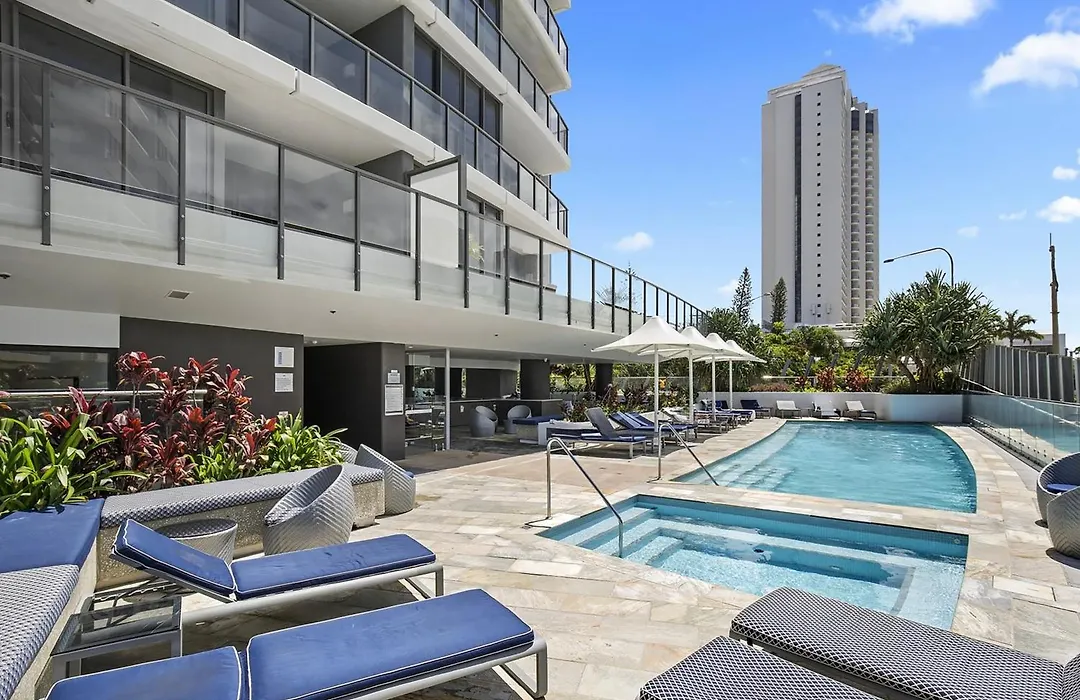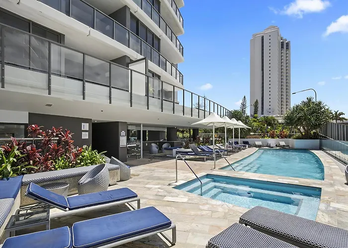 Seabright Nook - Resort Perks & Sky Views By The Sea has an oven and a dishwasher at an equipped kitchenette for preparing meals. Robina railway station is about 20 minutes by car from the apartment. This apartment features an outdoor swimming pool and a sun deck for guests' comfort.
